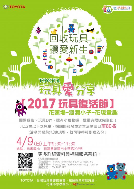 台灣玩具圖書館協會辦理TOYOTA玩具愛分享「2017玩具復活節-洄瀾小子『花現童趣』」活動DM,請踴躍參加!